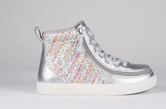 Bringing a sparkle of happiness to every step, the Silver Rainbow BILLY Classic Lace High Tops are sure to deliver. Built around the BILLY Classic High Top silhouette, these fun kicks come with functional laces for a custom fit, removable insoles for added depth, and a wraparound zipper for unmatched convenience. Your kiddos are going to feel good when they Step In!
