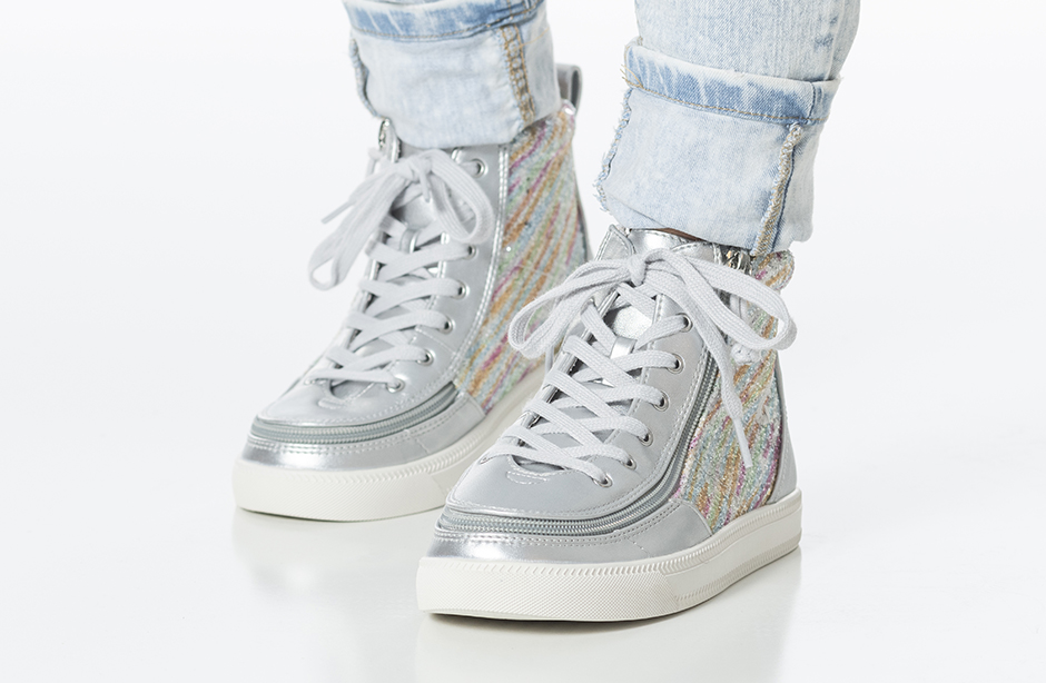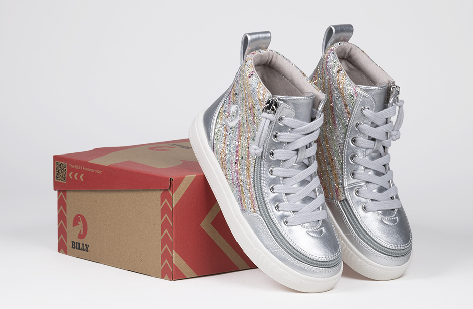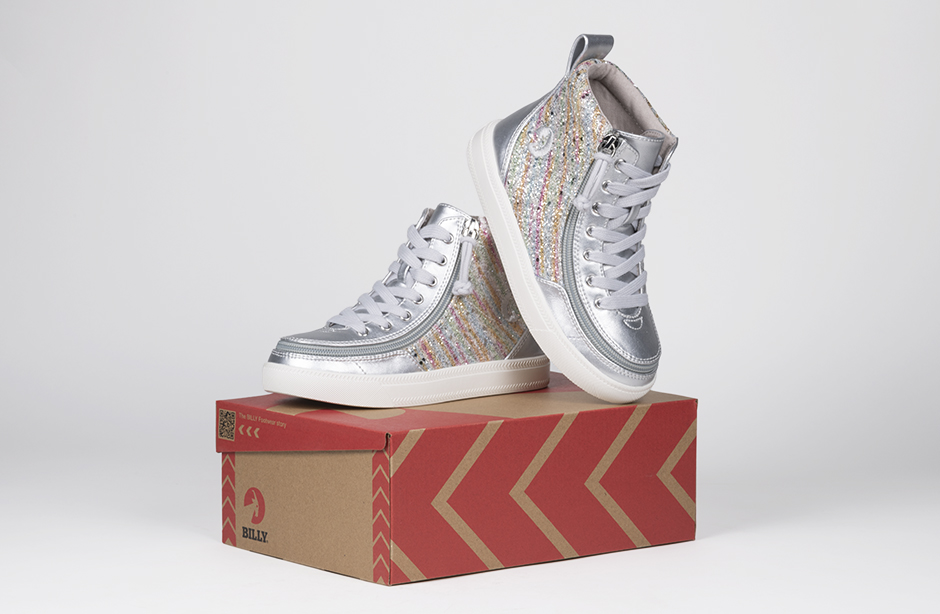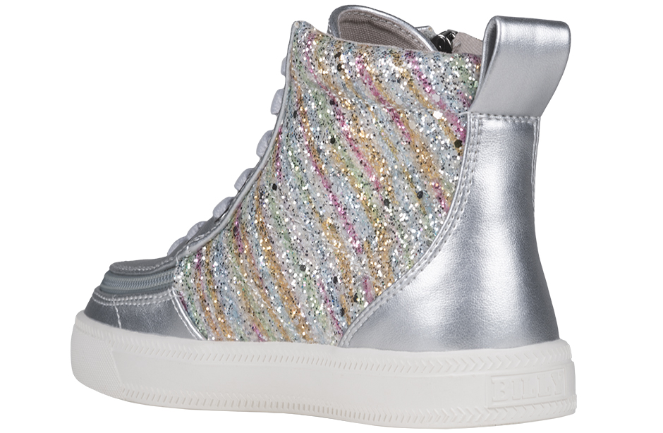 Bringing a sparkle of happiness to every step, the Silver Rainbow BILLY Classic Lace High Tops are sure to deliver. Built around the BILLY Classic High Top silhouette, these fun kicks come with functional laces for a custom fit, removable insoles for added depth, and a wraparound zipper for unmatched convenience. Your kiddos are going to feel good when they Step In!